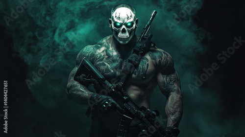 Muscular Man with Glowing Eyes and Rifle in Dark Fog