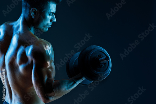 Muscular model sports young man with dumbbells in hand on dark background. Fashion portrait of strong brutal guy. Sexy torso. Male flexing his muscles.