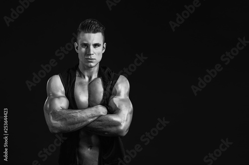 Muscular model young man on dark background. Strong brutal guy showing his biceps triceps, flexing his muscles. Sexy naked torso, six pack abs. Sport workout bodybuilding healthy lifestyle concept.