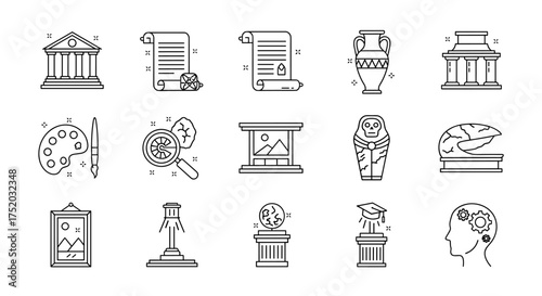 Museum and history icon set. Thin line icons for art gallery, archaeology, paleontology, and science. Ancient artifacts, scrolls, vases, and education symbols. Vector pack.