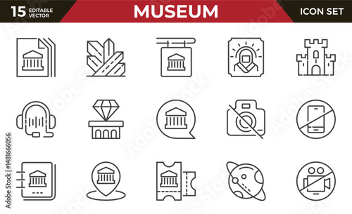 Museum line icons set. Art gallery, archaeological, historical exhibition, sculpture, ancient exhibits.Outline icon collection.Conceptual pictogram and infographic.