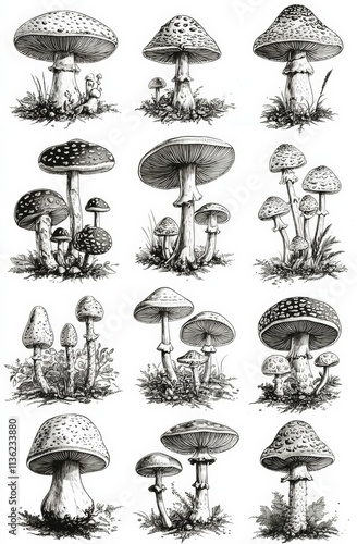 Mushroom and toadstool collection - vector vintage illustration from Petit Larousse Illustre 1914 , isolated on white background, , copy space, copy space for text,