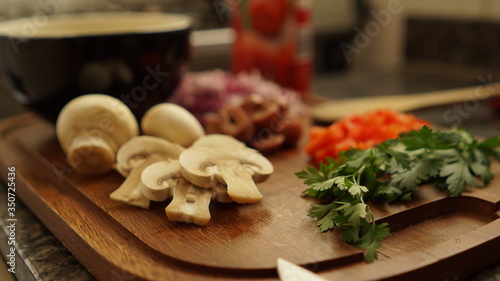 mushroom and vegetables prepared for healthy cooking, olives, onion, parsley