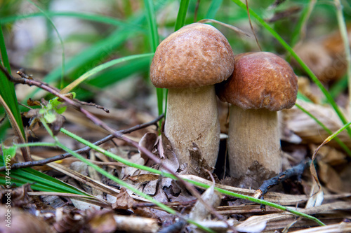 Mushroom family of boletus mushroom in the wild. Porcini mushroom grows on the forest floor at autumn season..