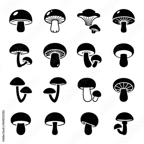 Mushroom icon set in black silhouette style for edible fungi, cooking, and wild forest illustrations