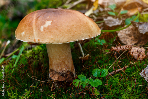 Mushroom in forest Porcino, bolete, boletus.White mushroom on green background.Natural white mushroom growing in a forest.