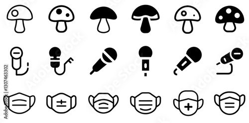 "Mushroom, Microphone, and Medical Mask Icon Set – Nature, Communication, and Health Vector Symbols"