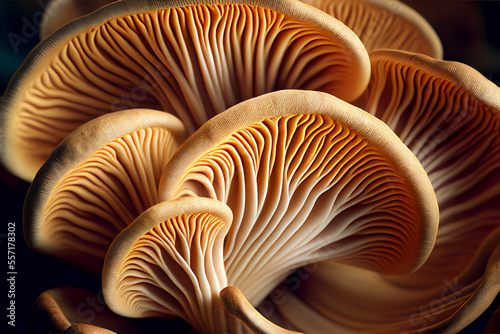 Mushroom oyster background. Spectacular mushrooms close up on a black background. Ai generated image illustration