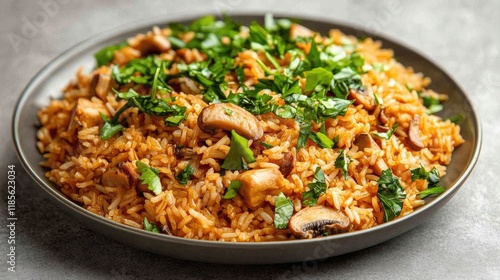 Mushroom rice pilaf garnished with fresh greens served on a stylish gray plate against a neutral background