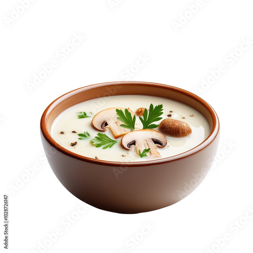 Mushroom soup isolated on a white background, highlighting its creamy texture and earthy tones in a simple bowl. PNG