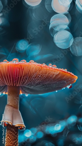 Mushroom with water droplets on the cap at dusk, macro photography. Nature details and serenity concept
