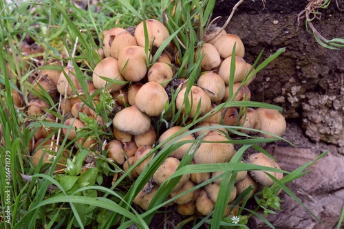 Mushrooms at the base of a walnut tree trunk fallen by rot.