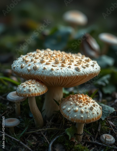 Mushrooms growing in a forest setting under soft natural light during early morning hours