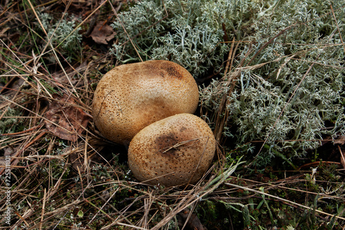 mushrooms in the forest, Lycoperdon perlatum, the common puffball,