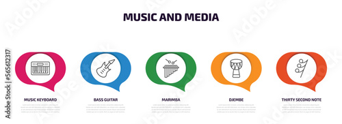 music and media infographic element with outline icons and 5 step or option. music and media icons such as music keyboard, bass guitar, marimba, djembe, thirty second note rest vector.