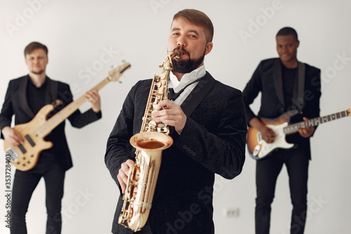 Music band in a studio. Guy in a black suit. Musician with saxophone.