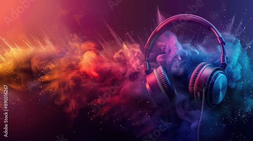 music banner with headphones and colorful abstract dust or smoke background. Generated AI