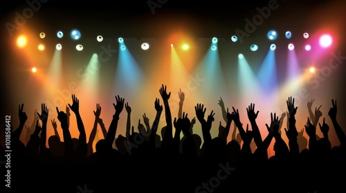 Music festival atmosphere with hands in the air and silhouettes of people against a backdrop of bright stage lights.