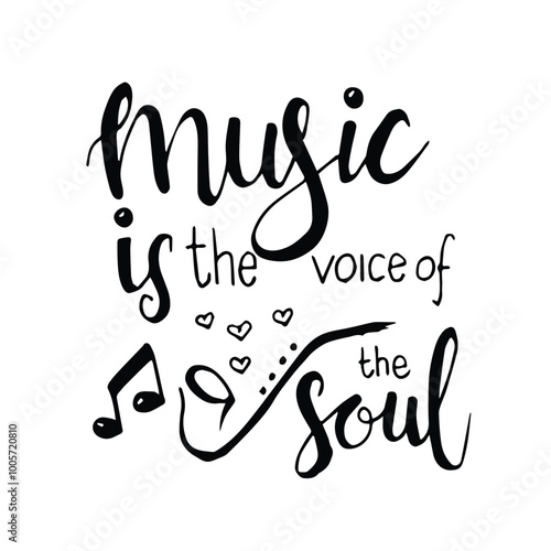 Music is the voice of the soul. Lettering with silhouette of jazz saxophone instrument hand drawn sketch