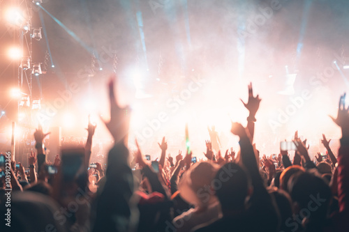 music, musician, entertainment, light, festival, audience, clubbing, crowd, dancing, disco. A crowd of people are at a concert, with many of them holding up their hands in the air.