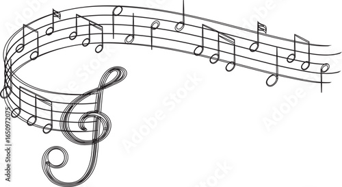 music notes on white background.The image shows musical notes on staves, seemingly floating or swirling in a stylized manner.
