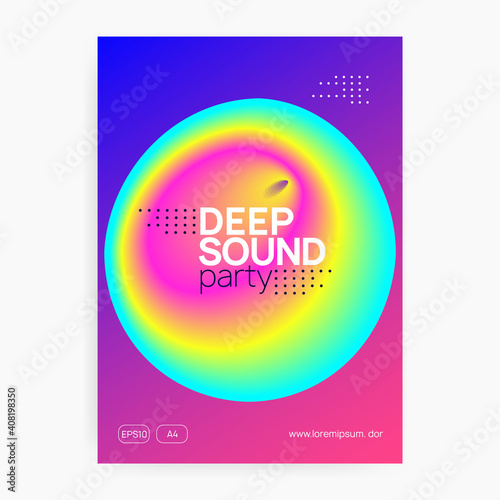 Music poster. Bright house concert magazine layout. Electronic sound. Night dance lifestyle holiday. Fluid holographic gradient shape and line. Summer fest flyer and music poster.