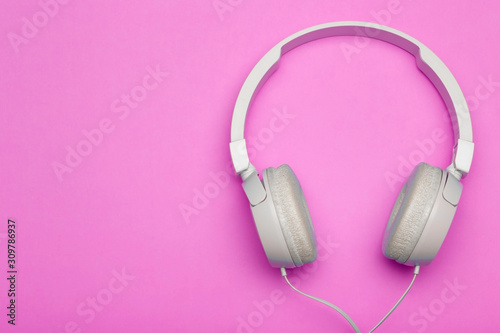Musical headphones on a colored pink background. Aesthetics retro 80s and minimal concept