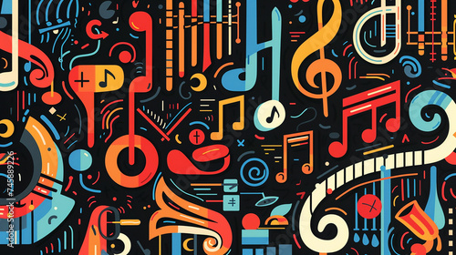 Musical notes and symbols arranged in a harmonious and rhythmic line art pattern.