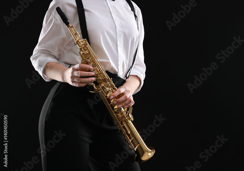 Musician with soprano saxophone on dark background, closeup. Space for text
