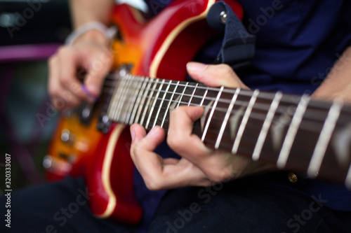 musician's hand is playing a red electric guitar in the recording room.