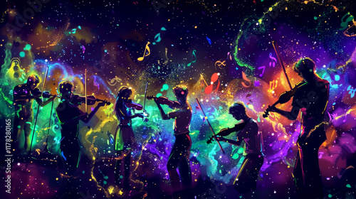 Musicians perform in open cosmic space, playing violins amidst a backdrop of bright, swirling colors and musical notes