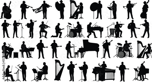 Musicians silhouette performing with diverse instruments, cad drawing flat vector illustration, concert ensemble layout, artistic sketch music band concept