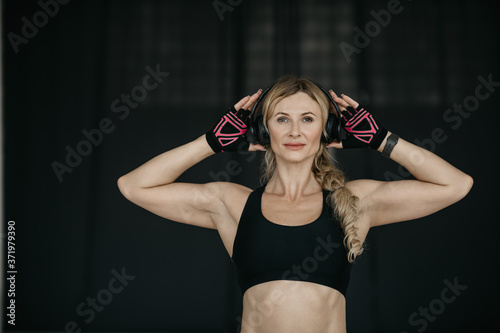 Musik, sport style and healthy lifestyle in middle aged. Friendly woman with fitness tracker, gloves and headphones