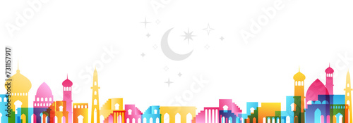 Muslim cityscape. Colorful horizontal border from traditional islamic architecture. Vector decorative divider.