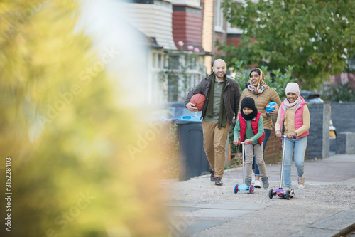Muslim family walking and riding scooters on neighborhood sidewalk