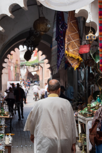 Muslim man with kaftan strolling alley with shop on the street, blurred background