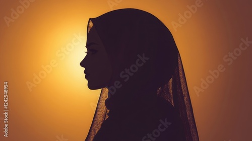Muslim woman silhouette against a warm golden sunset, showcasing elegant headscarf, profile view with soft light casting gentle shadows.