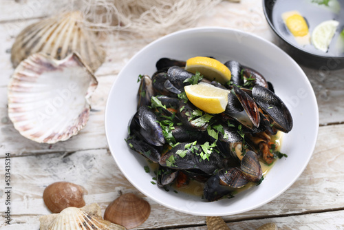 Mussels in wine-butter sauce, sprinkled with parsley, top view. Clams in a bowl, on white wood background.