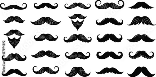 Mustache icon set with 25 unique styles including curly, straight, thick, thin, and beard combos