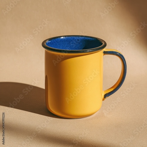 Mustard yellow mug with a cobalt blue interior and rim, a simple black line accents the rim, and a matching handle. The mug casts a shadow on a beige background