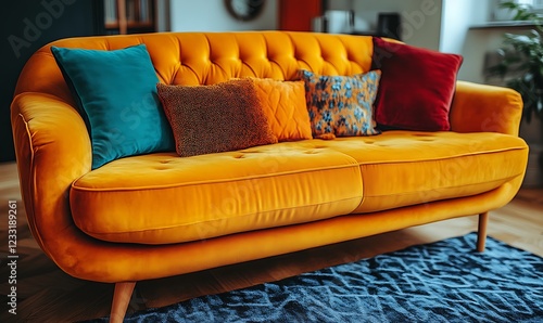 Mustard Yellow Velvet Sofa with Colorful Throw Pillows