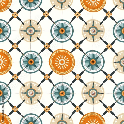 muted teal and orange geometric floral tiles on white background, seamless pattern with flowers