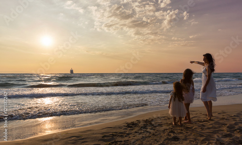 Mutter zeigt ihren Töchtern das Panorama des Sonnenuntergangs über dem Meer