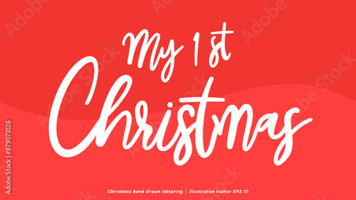 My 1 st Christmas brush calligraphy, Handwritten ink lettering, handwriting on red background, Flat Modern design ,Vector illustration EPS 10