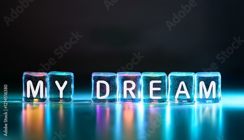 私の夢を意味する英単語のMY DREAMの文字が書かれた透明なキューブブロックが横に並んでいる。aiで生成