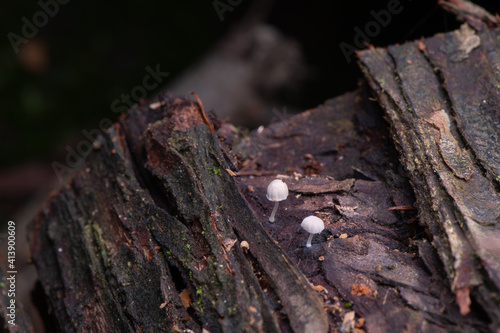 Mycena adscendens - Frosty bonnet. Tiny Saprophyte fungus growing on decaying wood