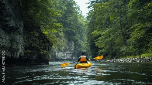 Myopia prevention with a man wearing glasses kayaking along a river. Outdoor adventure, wellness, and eye health