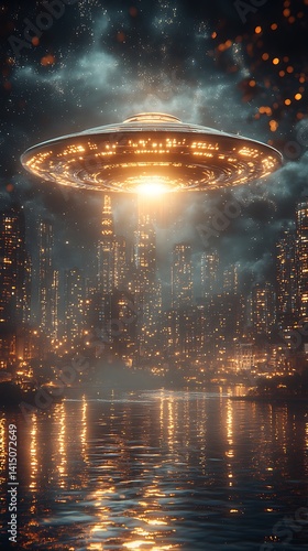 Mysterious alien spacecraft suspended in dark stormy sky Photo