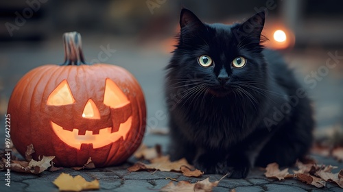 Mysterious Black Cat and Pumpkin in Enchanting Halloween Scene,Generative AI