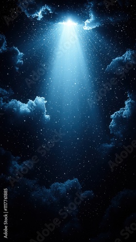 Mysterious blue light shining through dark clouds at night creating a surreal atmosphere
